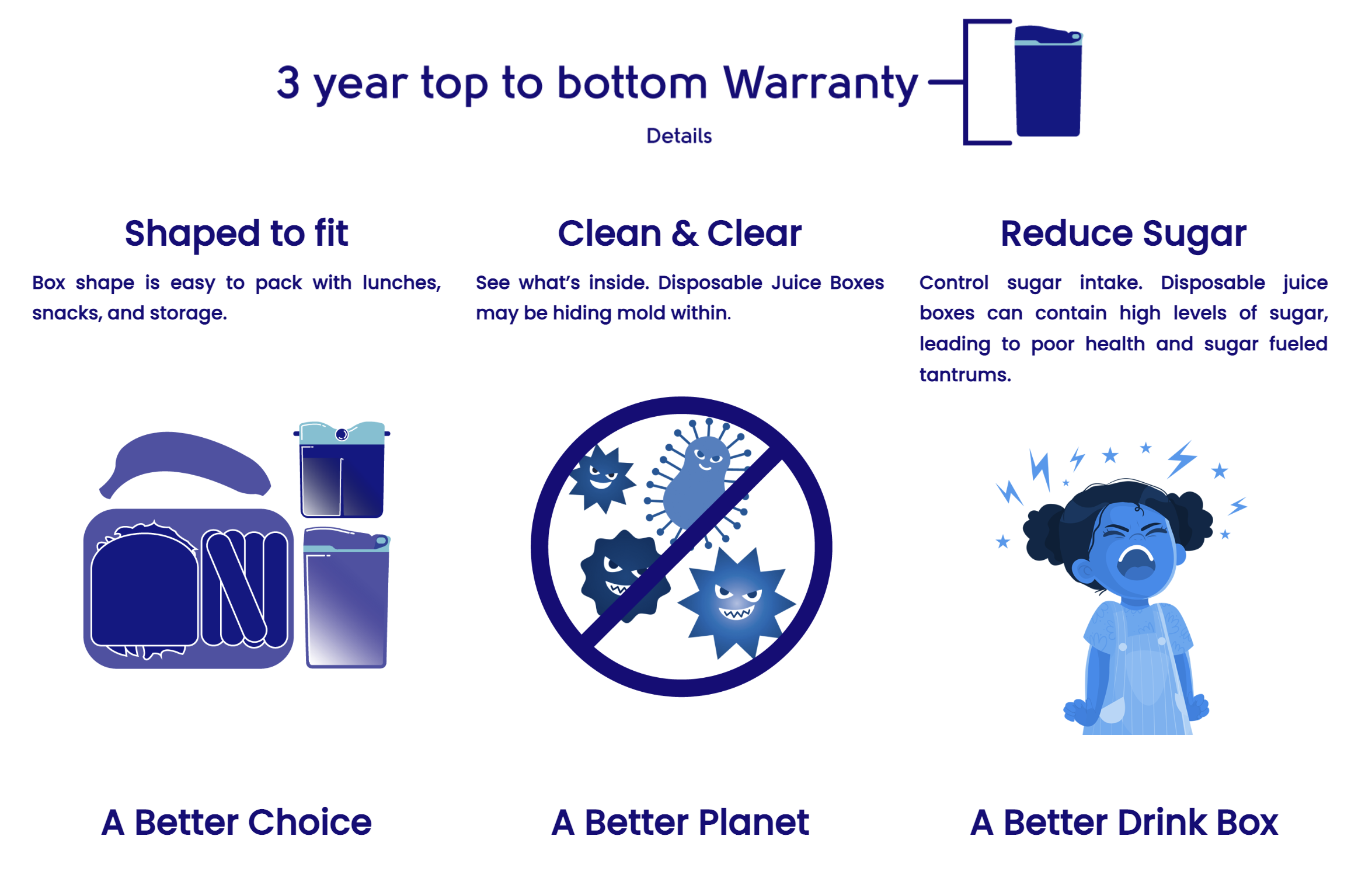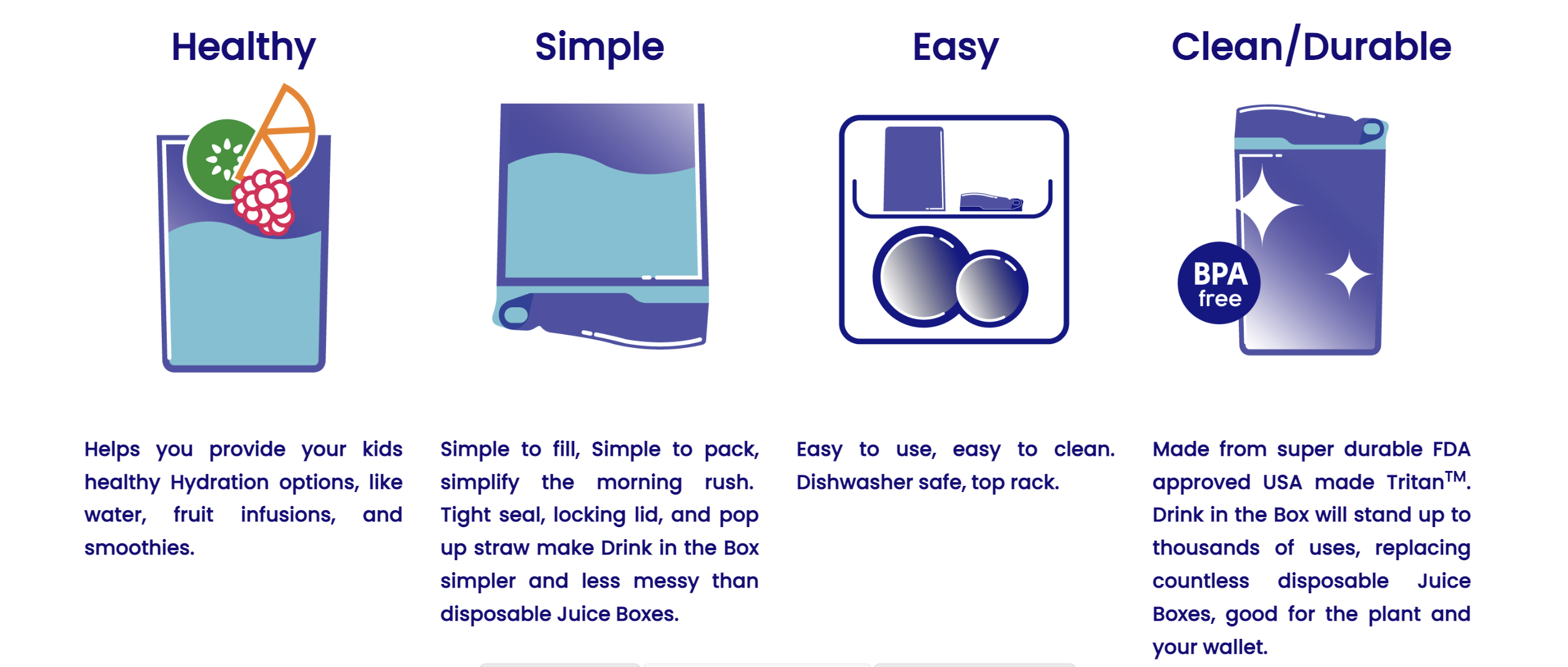 Drink in the Box is part of a zero waste lunch. Durable enough for years of use. Replaces countless disposable Juice Boxes