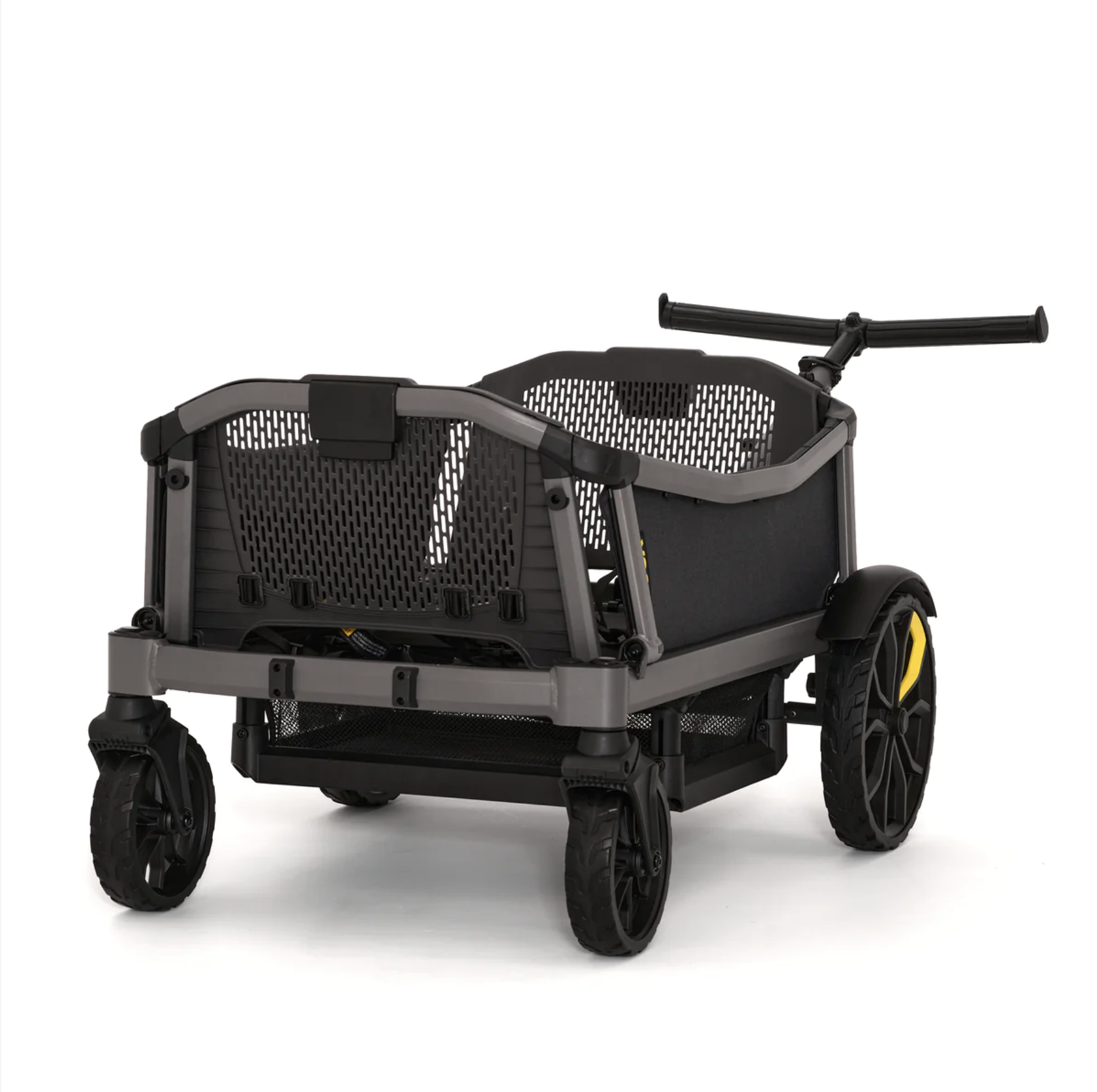 Cruiser City gives your family the fun and all-terrain versatility of a Cruiser but offers the push steering and ample kickspace of a traditional stroller. Cruiser City is perfect for families that love to push on sidewalks, paths and through local attractions with seating for 2. Cruiser City features swivel wheels furthest from the handle, which enable it to be steered like a traditional stroller when pushing on smooth terrain. But don't worry, the handlebar can also drop into wagon mode for pulling over uneven terrain.