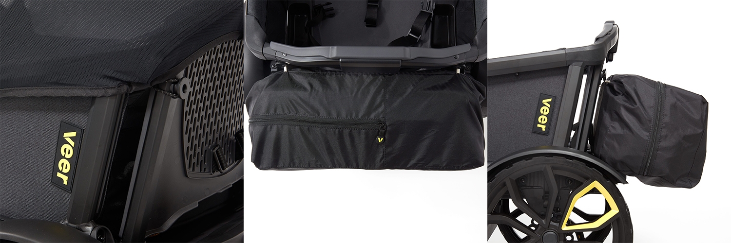 Veer’s Nap System turns your Cruiser into a JPMA safety-certified Bassinet, making your Cruiser the ultimate rest stop or changing station for young ones. (The Nap System is suitable from birth up to 20 lbs. [9 Kg] and 27” [69 cm], whichever comes first or until your infant pushes up on their hands and knees.) A soft, removable mattress pad is included. The Nap System includes magnets built into the cleanable sidewalls that keep it snug to the Cruiser sidewalls and includes four bungee connection cords that attach to the seat backs to keep little ones safe. A bug shield that zips on a sun canopy to cover the Cruiser is included (retractable sun canopy sold separately). The Nap System makes a great changing station as well. The Nap System compactly folds into a storage bag that mounts to Cruiser and also fits in the Foldable Storage Basket when not in use.