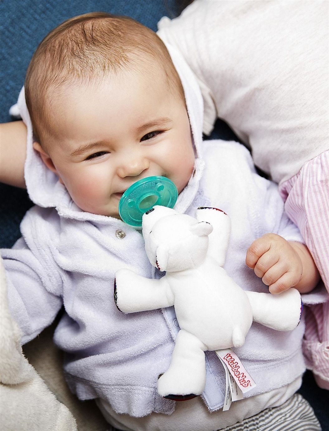 - Plush animal makes it easy for baby to grasp and manipulate the pacifier.